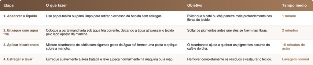 Manchas de café e chá podem ser removidas com ingredientes simples da cozinha. Bicarbonato, vinagre e detergente ajudam a quebrar pigmentos dos taninos e recuperar roupas sem produtos caros.