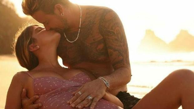 Na publicação feita no último domingo(01), o casal aparece em uma praia, enquanto o ator acaricia a barriga da amada para anunciar a gestação.
