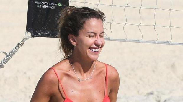 A apresentadora global treinou futevôlei na areia carioca, usando um biquíni em um tom vermelho rosado, de alcinha, colocando para jogo seu corpão sarado.