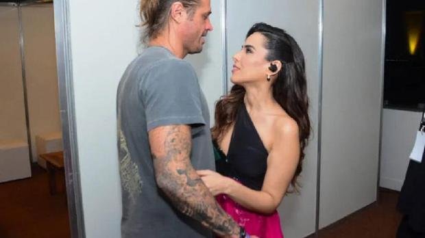 O casal foi flagrado em momentos de afeto nos bastidores do evento, onde a cantora interagiu com a imprensa antes de seu show.