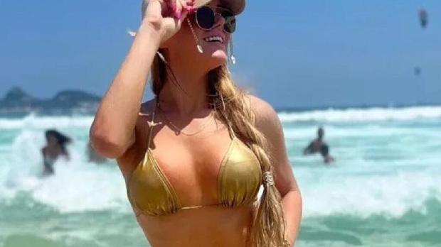 Thalita Zampirolli, Rainha de Bateria da Unidos de Padre Miguel, exibiu sua boa forma em um dia de praia no Rio de Janeiro, usando um biquíni dourado, ela surgiu nas imagens se divertindo.