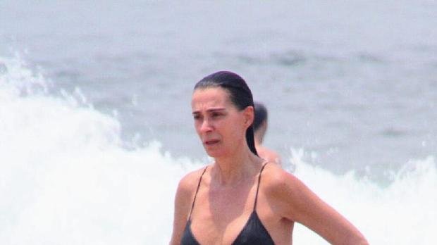 Na sequência, a artista de 55 anos de idade estendeu uma canga na areia e aproveitou para renovar o bronzeado. Neste momento, ela usou óculos escuro para se proteger do sol intenso. Veja as fotos: