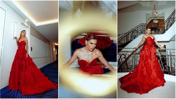 No tapete vermelho, Erika também chamou atenção com um vestido vermelho assinado pelo estilista Israel Valentim. A peça, feita em ziberline, foi desenvolvida ao longo de mais de 160 horas e traz milhares de pétalas cortadas a laser, aplicadas manualmente para criar movimento e leveza. O busto é contornado por cristais Swarovski, conferindo ainda mais brilho à produção.