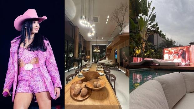 Entre os destaques, está a automação inteligente, que inclui iluminação controlada por comando de voz. Com bom humor, ela mostrou como ativa o sistema: "Alexa, a boiadeira chegou", disse, acionando as luzes da casa.