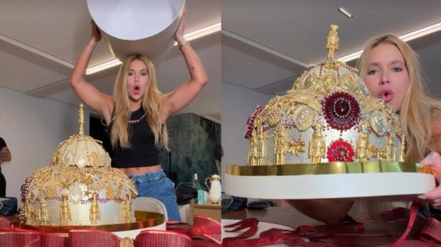 Ela agradeceu ao confeiteiro responsável pela criação e revelou que levará o presente para o Rio de Janeiro, onde participará da festa de aniversário de um dos irmãos de Vini Jr., seu namorado. "Eu vou para o aniversário do meu cunhado hoje lá no Rio, vou levar para o pessoal comer, porque nem tem gente aqui para comer isso. É muito grande, imenso. Vai até andar de avião hoje", disse, divertida.