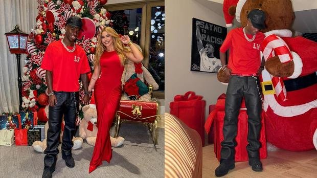 Complementando o visual, ele vestia uma camisa vermelha da Louis Vuitton, bordada com pedras no logo LV, que trouxe um toque festivo ao outfit, com valor de 8 mil reais. Nos pés, Vinicius usava uma bota Timberland personalizada pelo artista Mattias Gollin, conhecido por adicionar pedras brilhantes a tênis e botas, tornando cada peça única. Como se trata de uma customização, não há valor comercial definido.