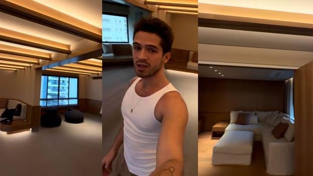 Apesar de ainda estar nos acabamentos, João explicou que o apartamento está começando a ganhar "cara de casa". Logo de cara, o filho do cantor Leonardo surpreendeu ao fugir da decoração tradicional, optando por um estilo moderno com toques rústicos e bastante madeira. A iluminação suave cria um ambiente intimista, sem a luz branca exagerada, lembrando a atmosfera japonesa - viagem que o artista realizou recentemente. Sofás curvos complementam a sala, reforçando o clima acolhedor.