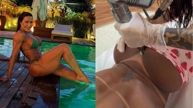 Gracyanne Barbosa, 42, deu mais um passo simbólico em relação à tatuagem Ãntima feita em homenagem ao ex-marido Belo, 51. Nesta terça-feira (10), a musa fitness compartilhou um reels da profissional Bruna Caroline, responsável pelo procedimento de remoção, mostrando o momento em que se deita na maca para apagar o nome do cantor, ao som da música "Razão da Minha Vida".