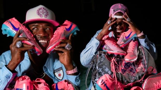 Em uma das fotos, VinÃcius Jr aparece rodeado por suas chuteiras da coleção Nike, incluindo a Mercurial Zoom Vapor 16 Pro "Vinà Jr Campo". O modelo foi desenvolvido para velocidade e explosão em campo e apresenta uma colorway vibrante em rosa e azul, com preço estimado em R$1.299,99.
