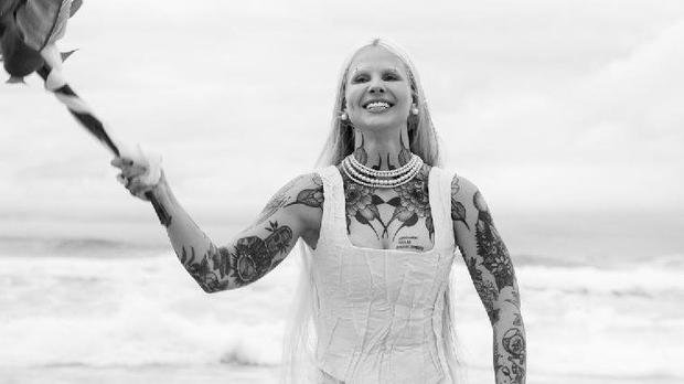 O Simbolismo: Bárbara veste um vestido de noiva com cauda pintada à mão, simbolizando o 'Sim' para si mesma, para Deus e para sua missão existencial.