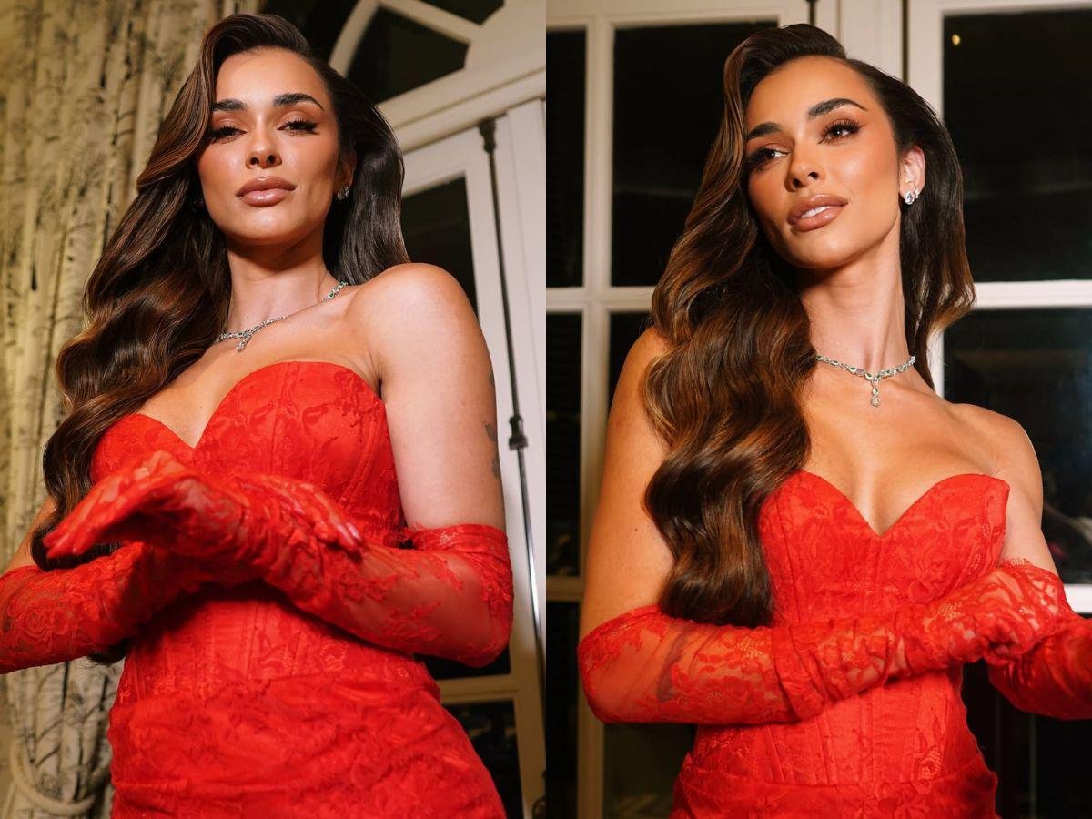 O vestido, feito sob medida pelo ateliê Victoria Alta Costura, tem uma silhueta marcada, decote profundo, saia midi com camadas e luvas que complementam o visual impactante da influenciadora.