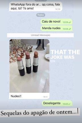 O marido de Sandy, o músico Lucas Lima, compartilhou através das redes sociais uma conversa que teve com a companheira no dia em que os aplicativos de comunicação estavam fora do ar.