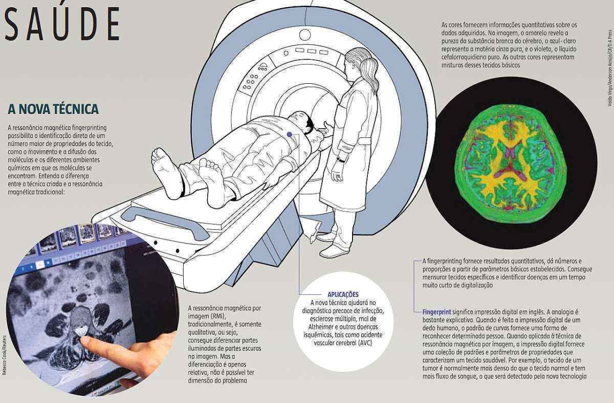 A ressonância magnética (RM) é uma técnica poderosa e versátil de exame de imagem. Na medicina, ela é largamente utilizada no diagnóstico de infecções no cérebro e na medula espinhal, ajudando a detectar escleroses, derrames, tumores e tendinites. Apesar de sua importância, a estrutura básica da tecnologia ficou praticamente inalterada durante quase 50 anos, mantendo-se restrita à sondagem qualitativa de um conjunto limitado de propriedades do corpo humano. Um estudo desenvolvido por pesquisadores da Case Western Reserve University, nos Estados Unidos, pode ser a chave para revolucionar o exame. Em artigo publicado na revista Nature, os cientistas apresentaram a ressonância magnética fingerprinting (MRF), capaz de analisar várias características físicas ao mesmo tempo, como a densidade do tecido e o fluxo sanguíneo em determinada região.