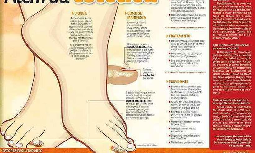 Hábito de roer as unhas pode ser sinal de transtorno de ansiedade e causar prejuízos à pele e aos dentesPelas unhas é possível saber o padrão alimentar de uma pessoaUnhas: manchas, ondulações e esfarelamento podem sinalizar que algo não vai bemAprender a usar a lixa é essencial para impedir que as unhas fiquem fracas e quebradiçasChuva pode transmitir doenças? Entenda os riscos para a saúdePele das mãos e dos pés estão sujeitas a envelhecimento precoce; veja formas de prevençãoVocê sabe o que pode desencadear a unha encravada? Veja as dicasCuidado com a micose pano branco, uma das mais comuns da estaçãoSeis dicas para evitar a unha encravadaSete dicas para deixar as unhas lindas a semana inteiraA pesquisa envolveu mais de 7.800 pacientes de 40 clínicas dermatológicas do Brasil e mostrou que 28% dos pacientes que participaram da investigação apresentavam a infecção causada por fungos, além dos 53% que tinham histórico da doença. “Muita gente desconhece que tem o problema, pois é assintomático. As mulheres acabam disfarçando com esmaltes; os homens com meias e sapatos fechados. Assim, a unha com sinais da doença acaba sendo deixada de lado. O problema é que a infecção não se cura sozinha e pode comprometer ainda mais a unha e até passar para a pele”, alerta a dermatologista Camila Cazerta, uma das investigadoras do trabalho.