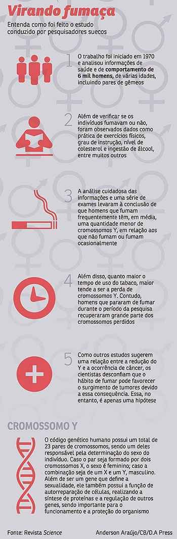 Na pesquisa, os cientistas utilizaram dados de mais de 6 mil homens de diferentes idades e levaram em conta fatores físicos e comportamentais. Os dados também foram comparados com os de mulheres, e, ainda, gêmeos foram recrutados para ajudar nas análises. Os autores notaram, então, que homens fumantes possuíam um menor número de cromossomos Y do que os não fumantes, e que essa perda parecia relacionada a um maior número de casos de tumores em homens do que em mulheres. “Nós já havíamos demonstrado uma associação entre a redução do cromossomo Y no sangue e um maior risco de câncer e descobrimos que a perda do cromossomo Y em uma fração das células do sangue era mais comum em fumantes do que em não fumantes”, destaca Forsberg.