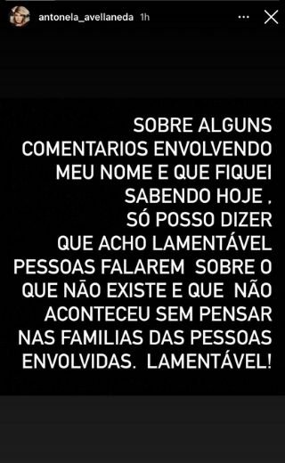 Antonela resolveu se pronunciar sobre os rumores que teria se deitado com o mágico no reality. Em suas redes sociais, a loira disse: "Sobre alguns comentários envolvendo meu nome e que fiquei sabendo hoje, só posso dizer que acho lamentável pessoas falarem sobre o que não existe e que não aconteceu sem pensar nas famílias das pessoas envolvidas.