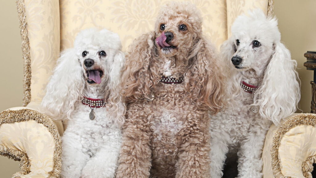 - Poodle Standard: o maior, com porte imponente e presença elegante. Geralmente mede mais de 38 centímetros.