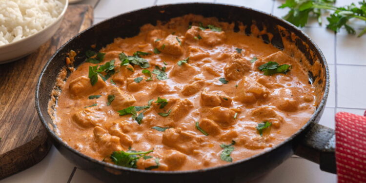 - Retorne o frango à frigideira e misture com o molho. Cozinhe até aquecer bem.