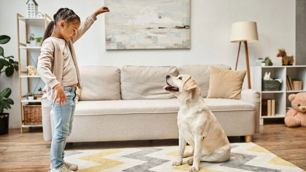 Menina ensinando o cão a sentar – Créditos: depositphotos.com / AllaSerebrina