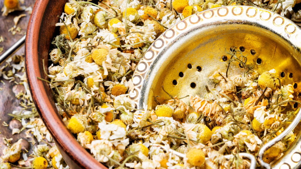 - Para camomila, use uma colher de sopa de flores secas por xícara de água, deixando em infusão por até 10 minutos.