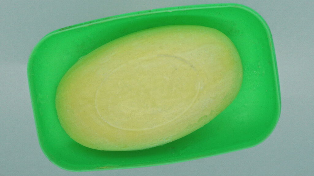 Sabão sólido se desgasta com o uso e deixa pequenos fragmentos que descem pelo ralo. Em contato com a umidade constante e a gordura corporal, esses resíduos formam crostas endurecidas.