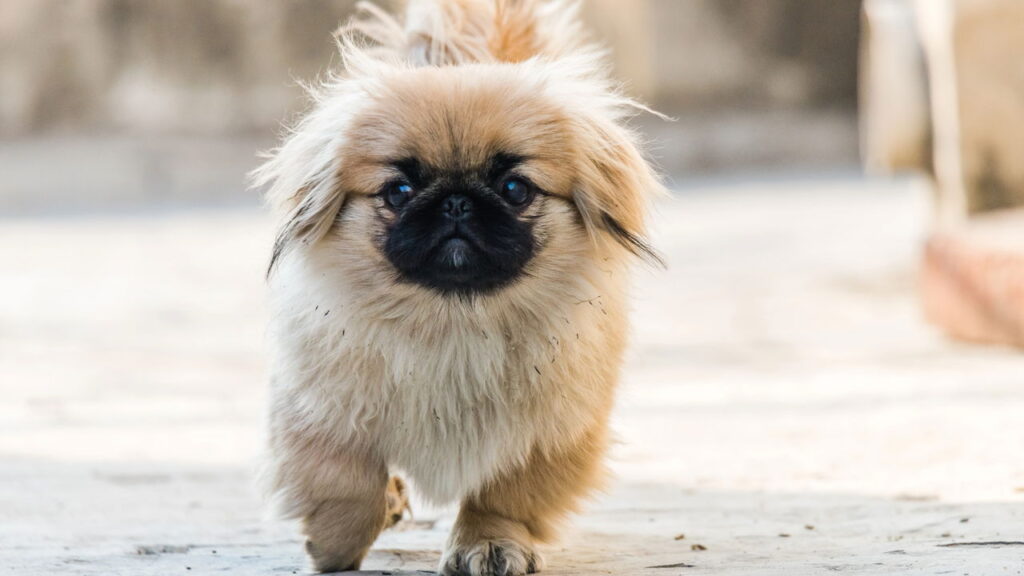 Com porte diminuto, o Pequinês tem focinho curto e expressão altiva. Apesar do tamanho, é um cão corajoso e até um pouco teimoso.