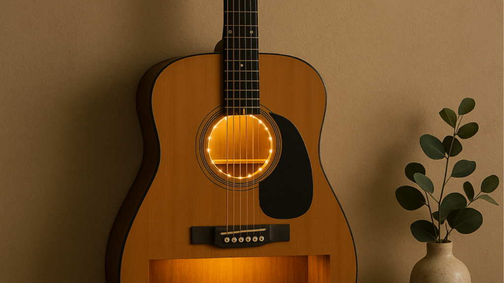 O violão oferece textura rústica e formato marcante, ideal para ambientes com toque boêmio ou retrô.