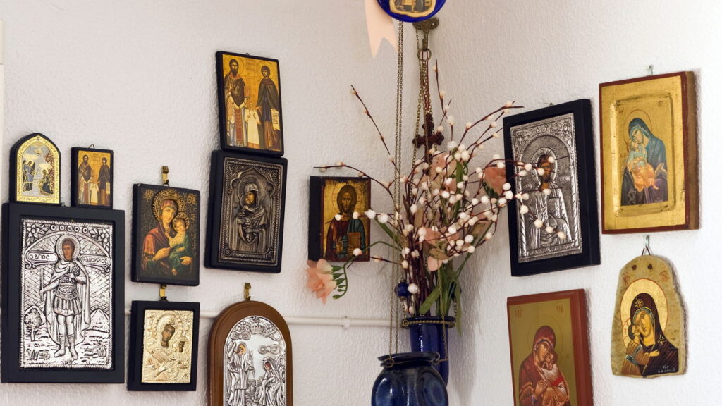 Elementos religiosos nas paredes criam uma atmosfera de segurança espiritual e conexão com tradições familiares.