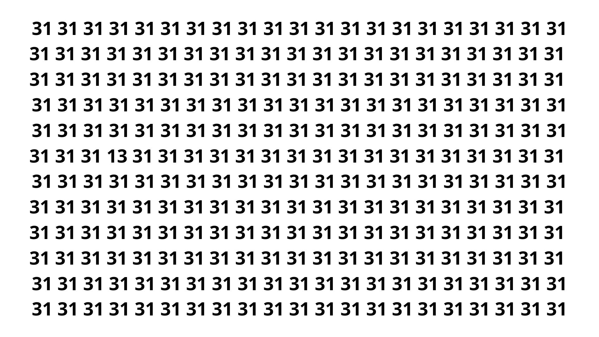 À primeira vista, pode parecer simples encontrar um número diferente. Mas há um truque visual poderoso aqui: nosso cérebro tende a reconhecer padrões em vez de detalhes. Quando vemos vários 31 repetidos, automaticamente entramos em um “modo automático” de leitura, o que torna o 13 quase invisível.