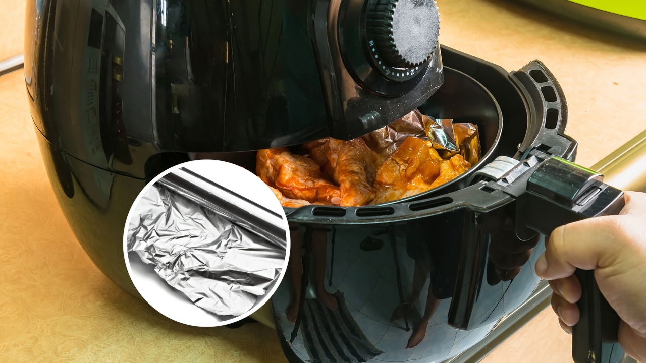 Colocar o papel alumínio apenas no fundo da cesta é a forma mais indicada. Isso mantém a passagem do ar quente ao redor dos alimentos.