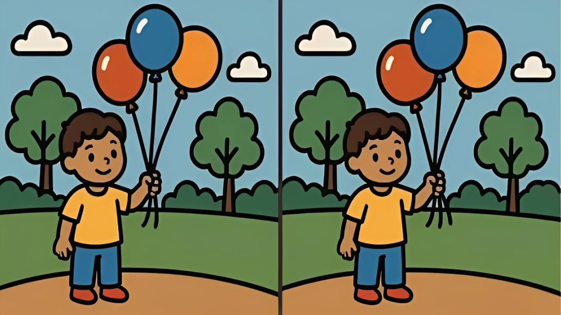 O desafio é simples, mas intenso: duas imagens lado a lado mostram um menino segurando três balões. À primeira vista, parecem idênticas. Mas, se observar com atenção, há três pequenas diferenças escondidas.