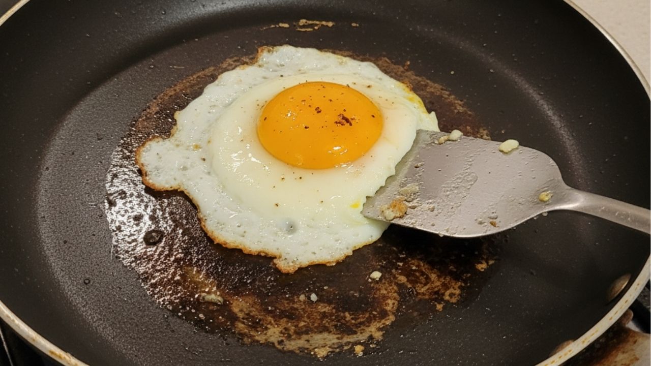 Quando o óleo queima, ele forma filmes pegajosos que “colam” o ovo à superfície.