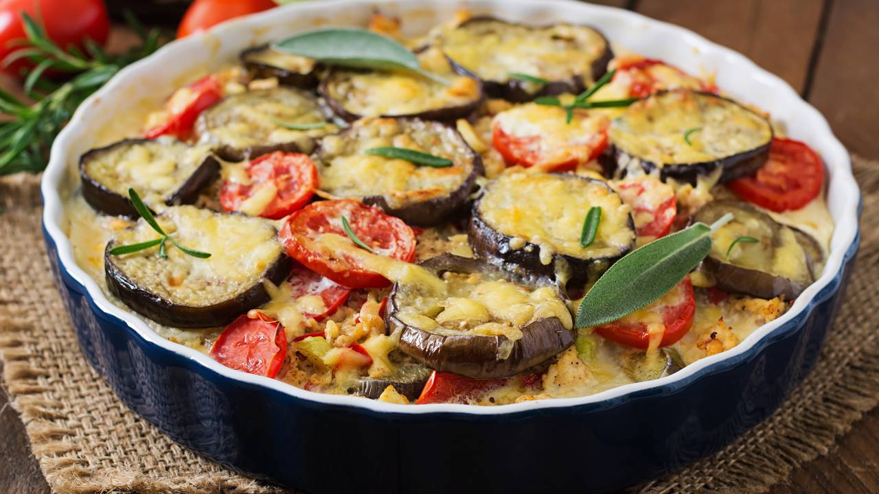 Modo de preparo: Preaqueça o forno a 180°C. Em uma frigideira, grelhe as rodelas de berinjela com um pouco de azeite até ficarem douradas. Em um refratário, alterne camadas de berinjela, molho de tomate e queijos. Finalize com o parmesão e leve ao forno por cerca de 20 minutos ou até o queijo derreter e dourar.