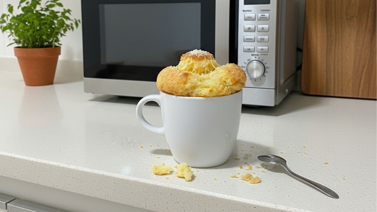 Seu pão de queijo de caneca está pronto para ser saboreado quentinho e com uma textura perfeita.