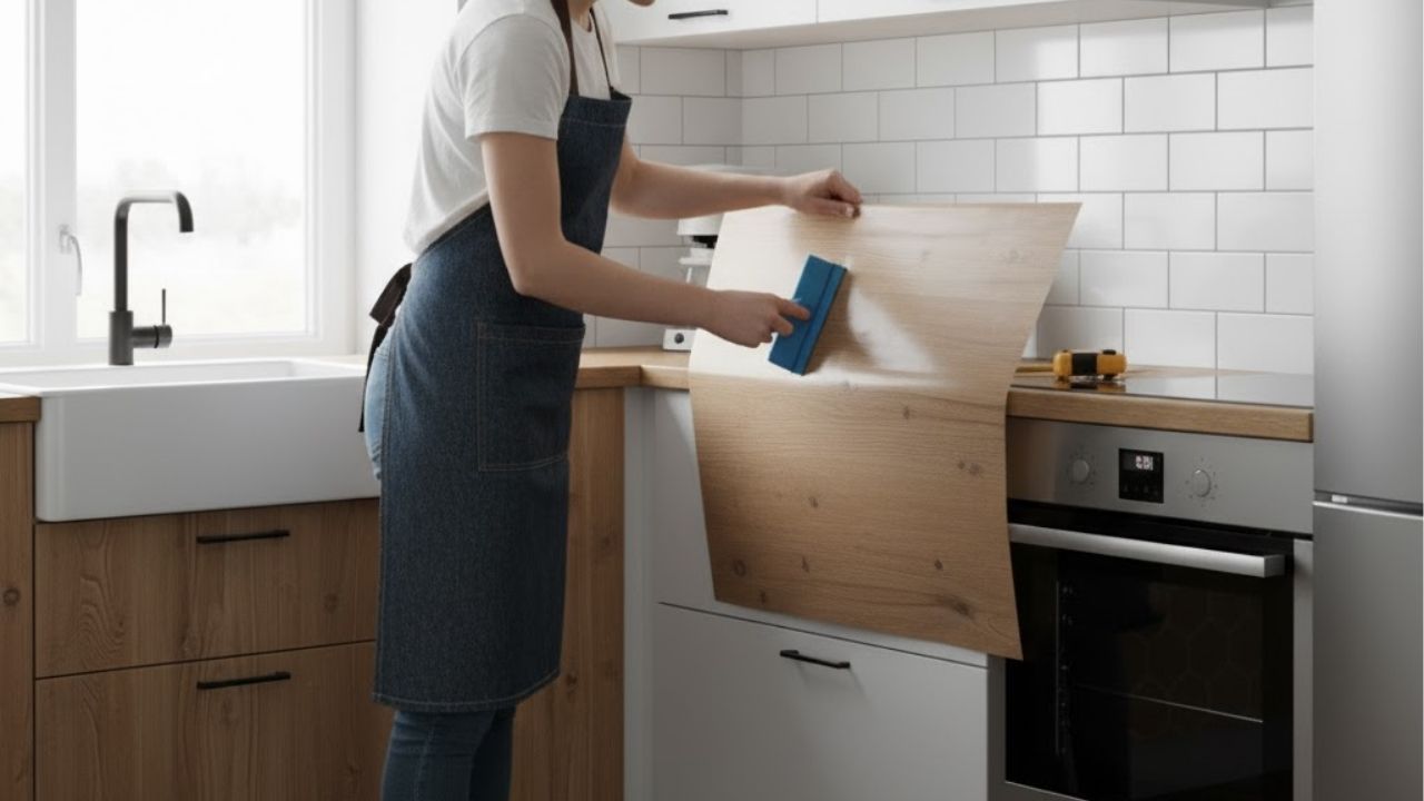 O ideal é usar papel adesivo vinílico, que é resistente à umidade e fácil de limpar, especialmente para áreas próximas ao fogão ou pia.