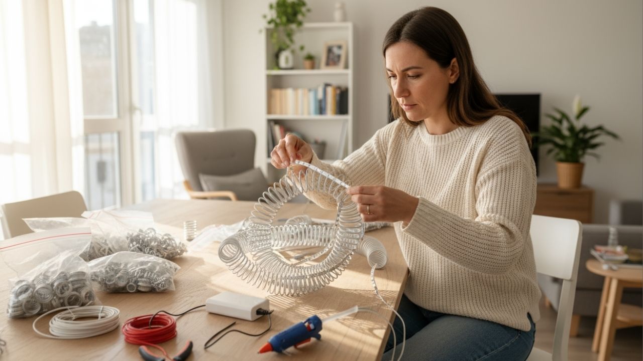 Com os materiais em mãos, o processo de montagem é simples. A mangueira flexível, que é o elemento principal, precisa ser esticada e moldada para formar a estrutura da luminária. Ela pode ser ajustada conforme o tamanho desejado, criando um formato único e criativo.
