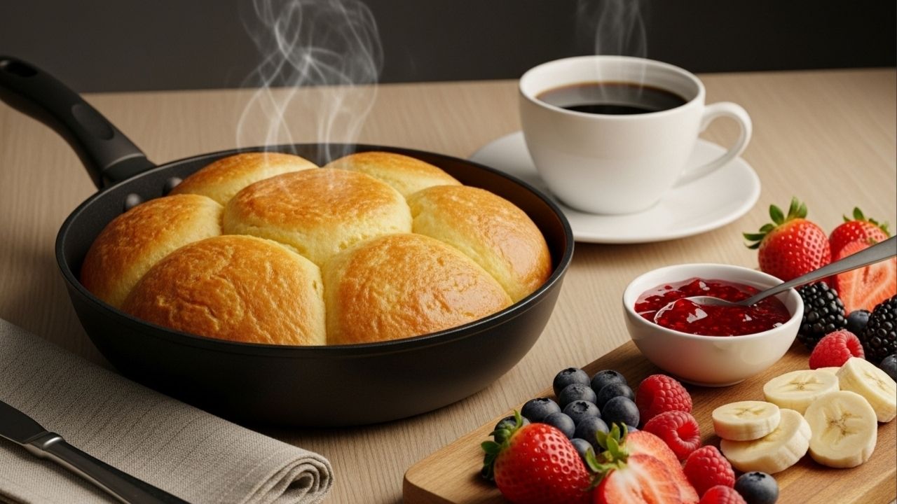 O pão de frigideira oferece praticidade absoluta para quem tem pouco tempo de manhã. Em vez de enfrentar longos tempos de preparo ou acender o forno, essa receita é feita diretamente na frigideira e leva menos de 5 minutos para ficar pronta.