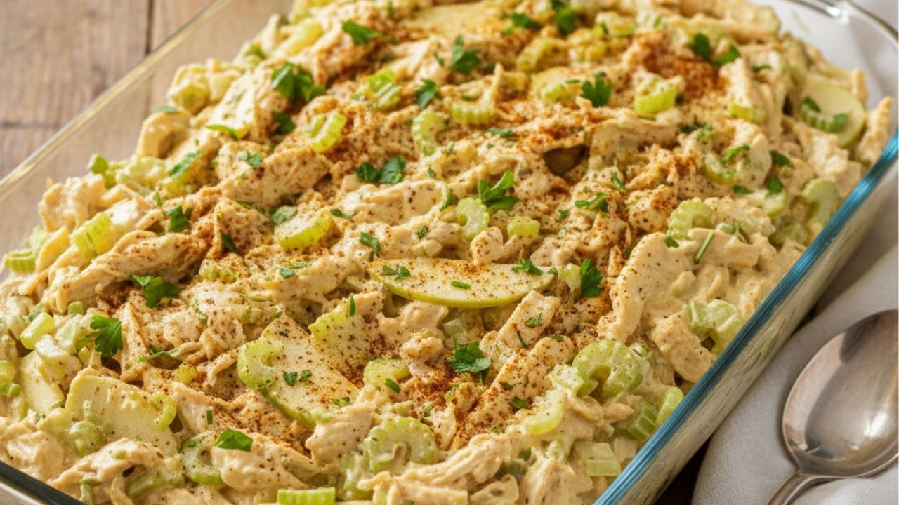 A etapa final reúne frango desfiado, maionese temperada e ingredientes frescos como salsão, maçã verde e limão, criando contraste entre crocância e suavidade. Isso equilibra sabores e impede que o prato fique pesado.