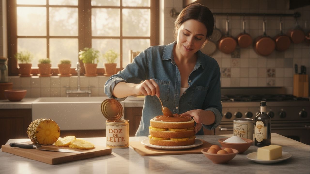 O segredo desse bolo está na combinação única de ingredientes frescos e a técnica de preparo. A massa fofa de pão de ló é a base que dá estrutura ao bolo, enquanto o recheio de abacaxi, doce de leite e o creme branco trazem a cremosidade que todos amam. Mas a verdadeira magia acontece quando tudo é montado e deixado para descansar na geladeira.