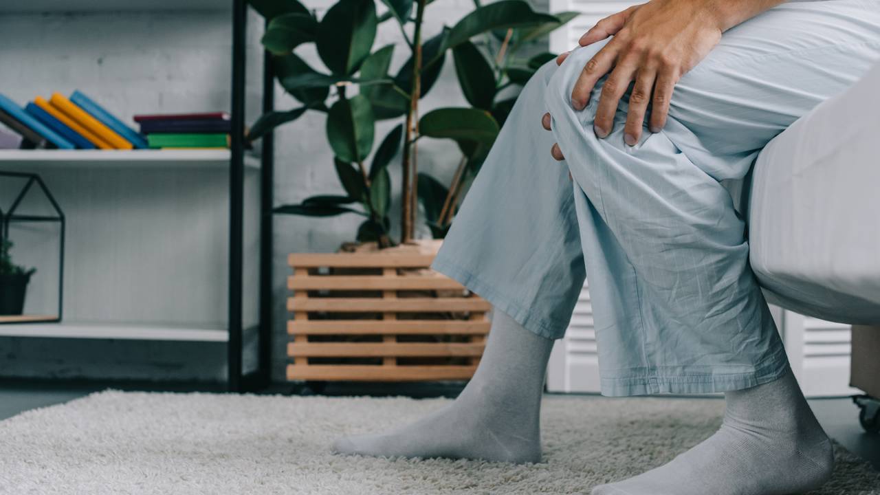 Homem com a mão no joelho sentado na beira da cama - Créditos: depositphotos.com / AndrewLozovyi
