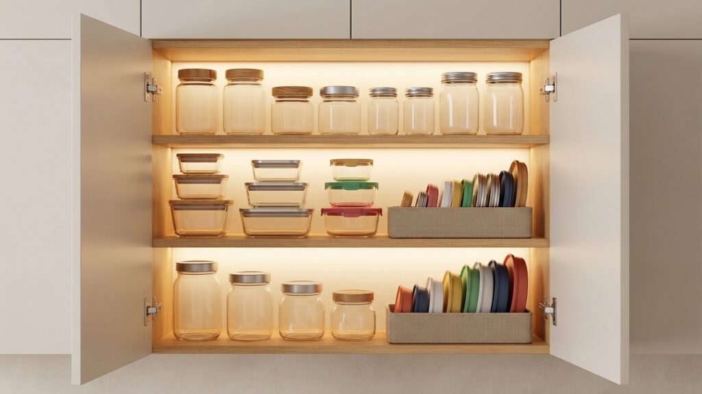 O chamado “método das famílias com tampas visíveis” resolve justamente isso: agrupa potes por tipo, dá um “lugar VIP” para as tampas e transforma o armário em algo que funciona no dia a dia. Na prática, parece até que o espaço dobrou, sem você ter instalado uma única prateleira a mais.