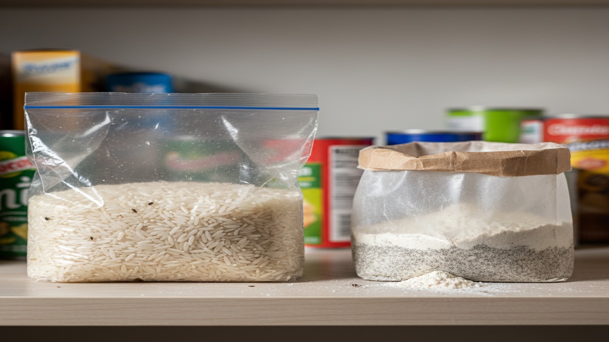 Pacote de arroz fechado por fora, mas cheio de pontinhos escuros por dentro. Pacote de farinha com pó esquisito no fundo. E, para completar, pequenos insetos andando entre os grãos. Além do nojo, bate aquela sensação de dinheiro jogado fora sempre que o armário “dá bichinho”.