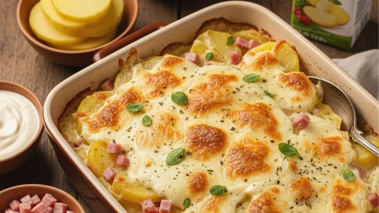 O creme feito com creme de leite e presunto acrescenta sabor e cremosidade à batata. Temperos como pimenta e orégano realçam ainda mais o resultado final.