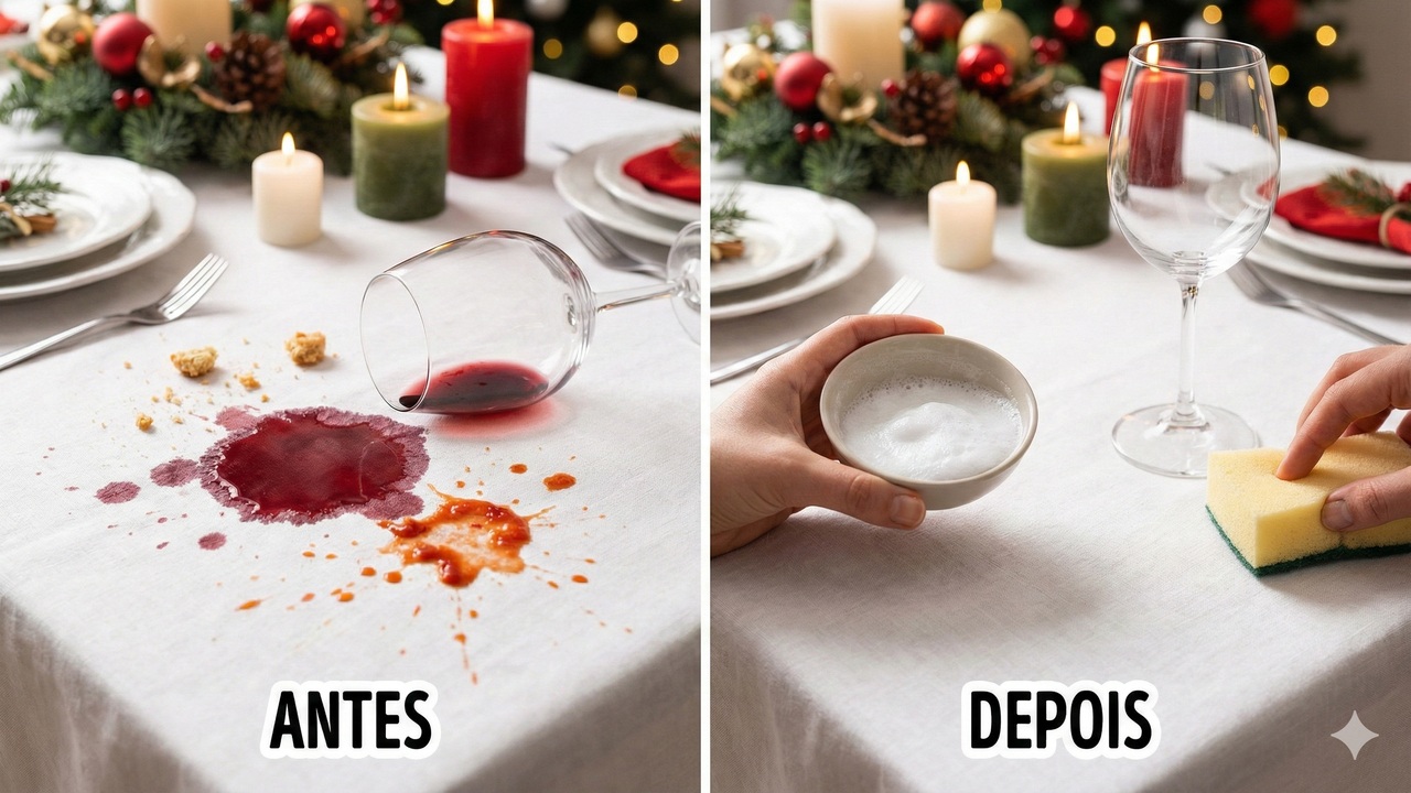 É cena clássica de fim de ano: a ceia está linda, a conversa animada, até que alguém gesticula demais e a taça de vinho (ou a colher de molho) vira sobre a toalha de mesa branquinha. O pânico é imediato, mas não precisa ser.
