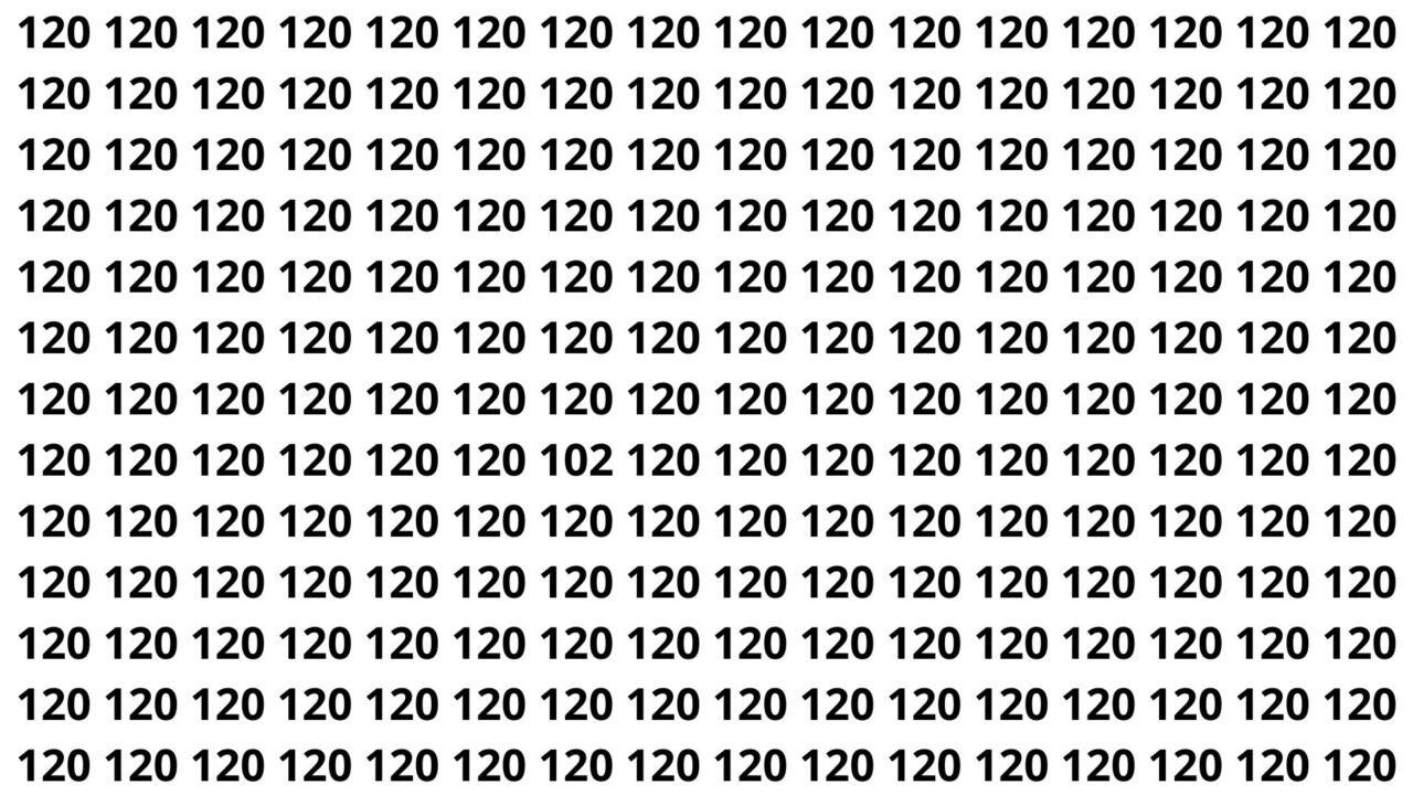 Neste desafio, a imagem está repleta do número 120 repetido em diferentes posições. Em algum ponto desse “mar de 120”, há um número 102 cuidadosamente escondido, quase se confundindo com os demais, exigindo máxima atenção visual.