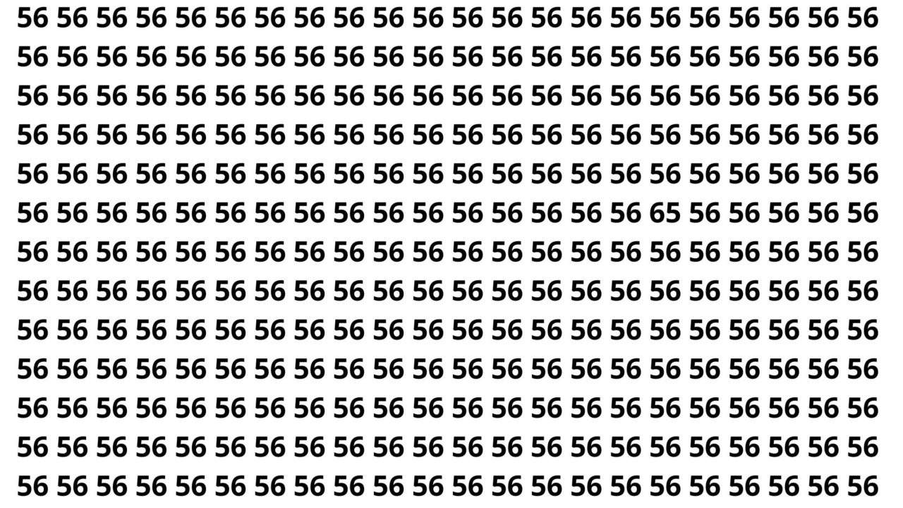Neste desafio, a imagem é preenchida quase totalmente pelo número 56, repetido em blocos, linhas e colunas muito próximas. Em algum ponto, porém, está oculto o número 65, cuidadosamente posicionado para se misturar ao padrão geral e enganar a visão rápida.