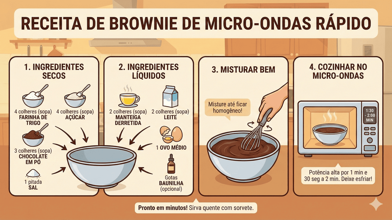 Você já chegou em casa morrendo de vontade de um doce, mas sem tempo nem disposição para ligar o forno, sujar várias formas e esperar tudo assar? É justamente nesses momentos que o brownie de micro-ondas em 15 minutos vira um grande aliado: pouca louça, ingredientes simples e uma sobremesa quentinha pronta quase na mesma hora em que você decide fazê-la.
