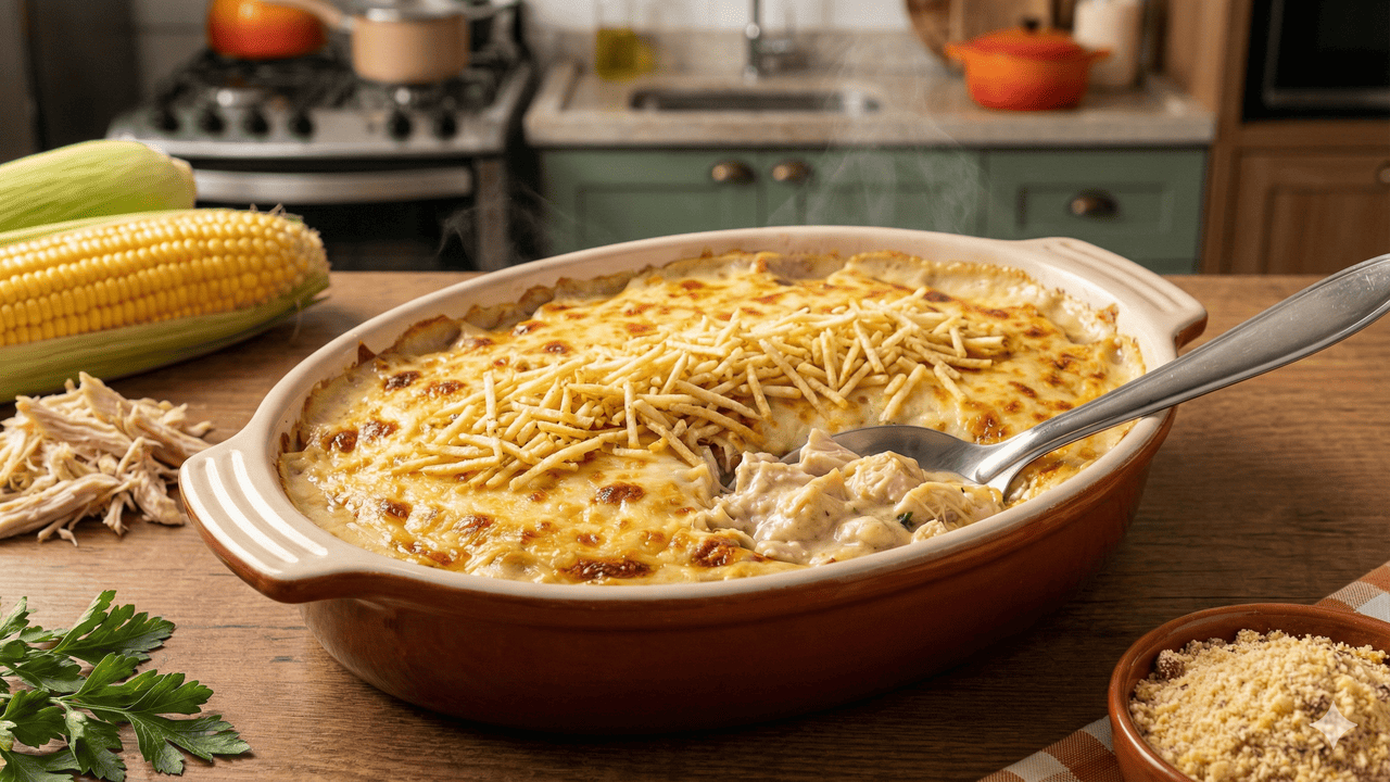 Fricassê de frango rápido em 35 minutos: frango desfiado, creme de milho e requeijão, gratinado com queijo e finalizado com batata palha para refeições práticas e saborosas.