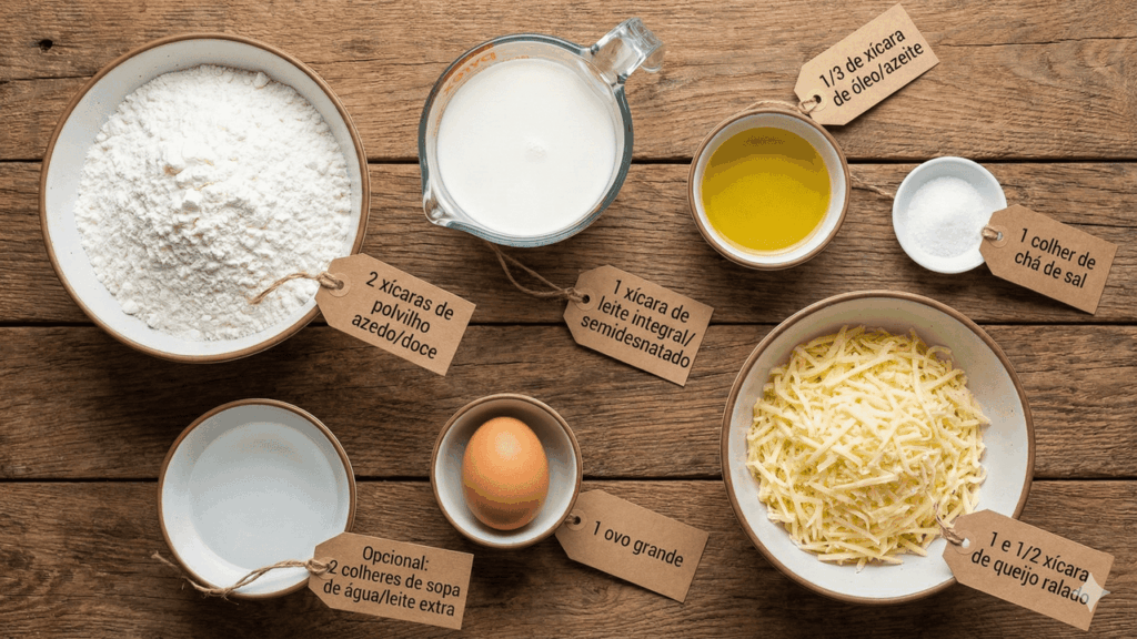 Algumas variações comuns incluem queijos com menos gordura, queijos mais curados, adição de ervas secas e mini pães de queijo recheados com cubinhos de queijo, presunto ou frango desfiado já pronto. Como a base leva polvilho, a receita costuma ser naturalmente sem glúten, mas vale conferir os rótulos dos queijos usados.