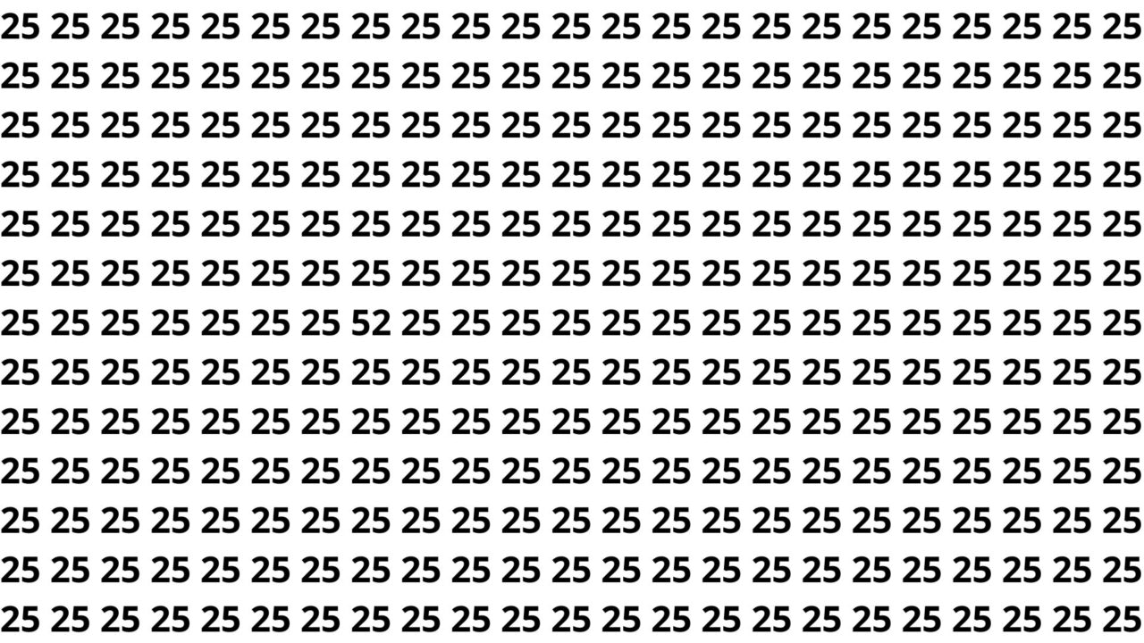 Na imagem do desafio “encontre o número 52 entre vários 25”, o número escondido costuma aparecer em uma das linhas intermediárias, levemente desalinhado em relação ao padrão dos demais números. Em vez de repetir o bloco visual típico dos 25, ele forma o 52, quebrando o ritmo da sequência e passando despercebido na primeira olhada.